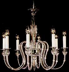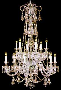 Bohemian crystal chandeliers were first made in 1724, when Josef Pallme-Mahl took the popular Flemisch brass crown design and made it entirely in glass. These chandeliers have an understated elegance of design and give an impression of lightness because of the transparency of the material. The gracefully curving arms make them the perfect complement to Baroque and other such ornate interiors. |